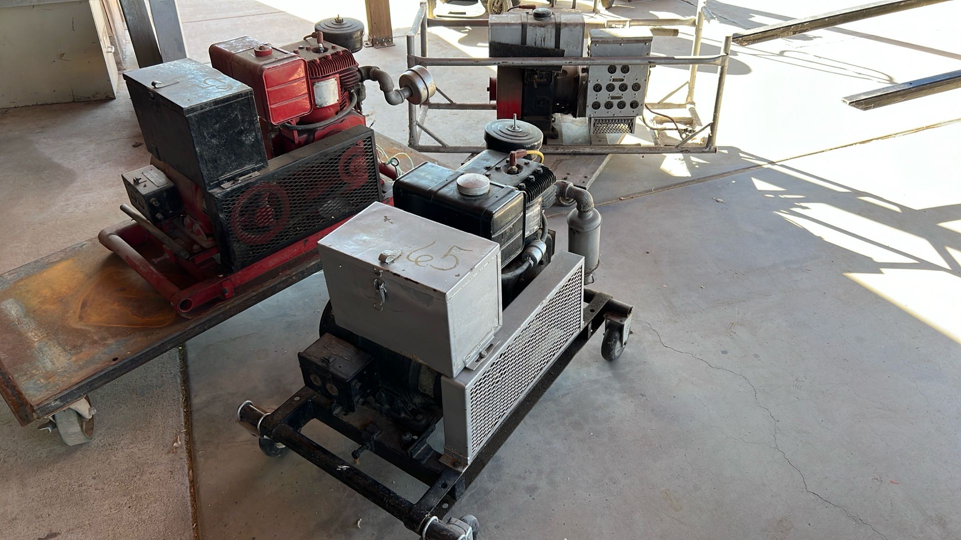 Three old military generators from the 1950s. One of them is electric start and has six and 12 V outlets. The black one has real hot spark and I’m sure it will run. The red one needs points. I bought three new old stock points, and one condenser. $125 each or buy all three for 300.