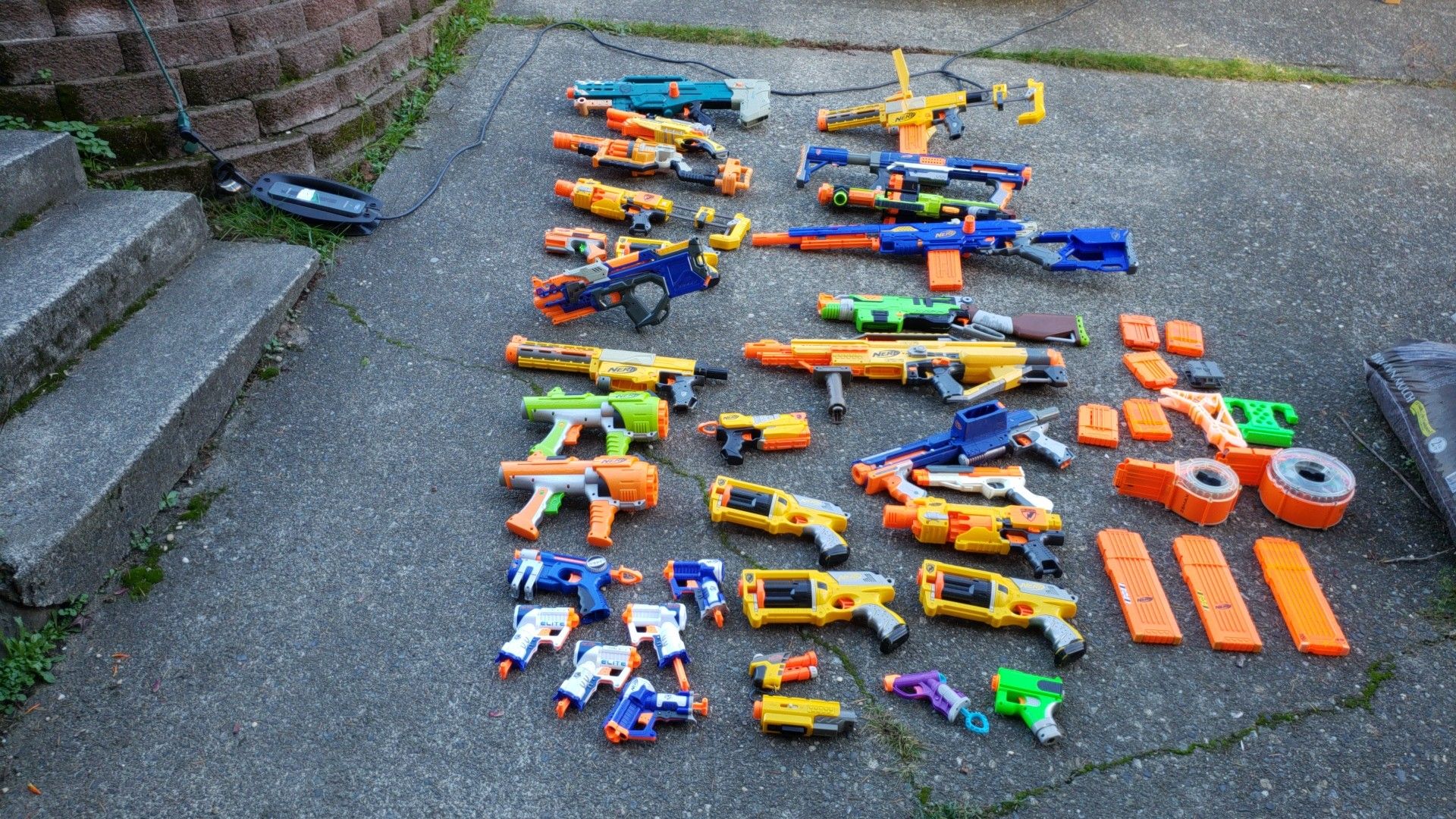 Over 30 Nerf Guns with a bunch of drums and magazines. Sorry no Nerf bullets. Bring a few if you want to test them out.