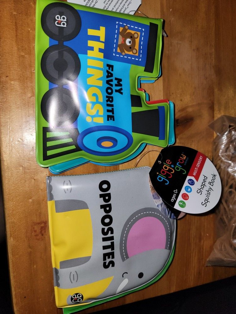 #NEW 2 GIGGLE & GROW BOOKS. MULTI SENSORY SHAPED SQUISHY & SQUEAKS. AGE 0 +