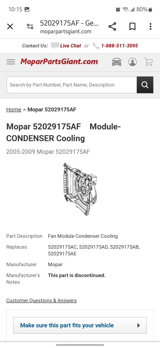 AC condenser fan assembly V6 3.7L V8 4.7/5.7L OEM part 5 2 0 2 9 7 1 5 AF CH3113 105 Brand new sealed in box. I've found it for as low as $126 on the internet and much more at the Dodge dealership.