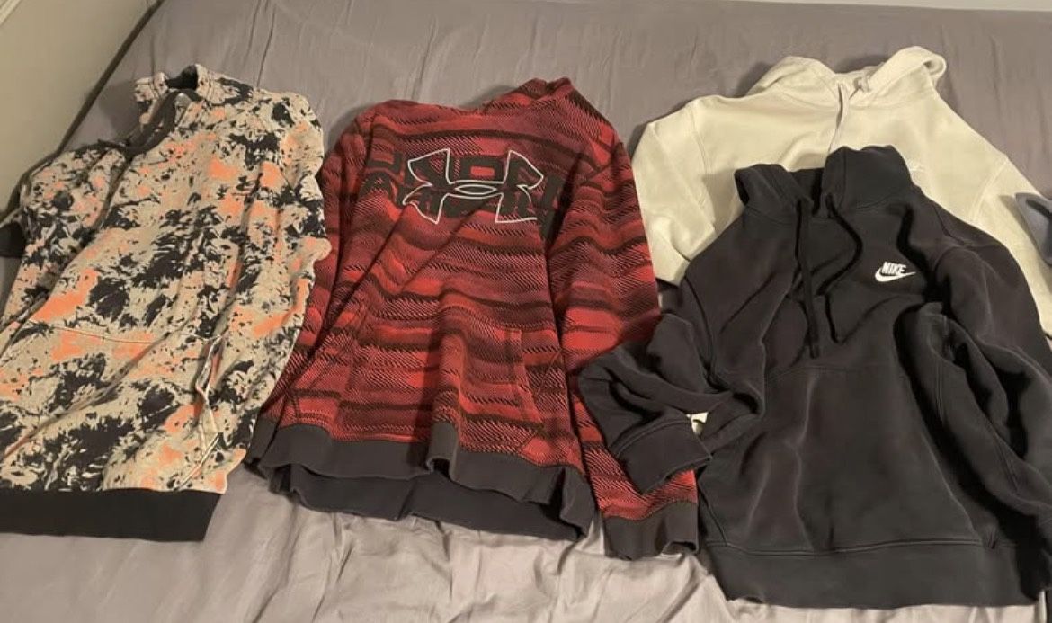 All hoodies show normal wear and may have small defects Sizes: Red Under Armor hoodie: Youth XL Orange camo Under Armor hoodie: Adult Small Bone and black Nike hoodie: Adult Small