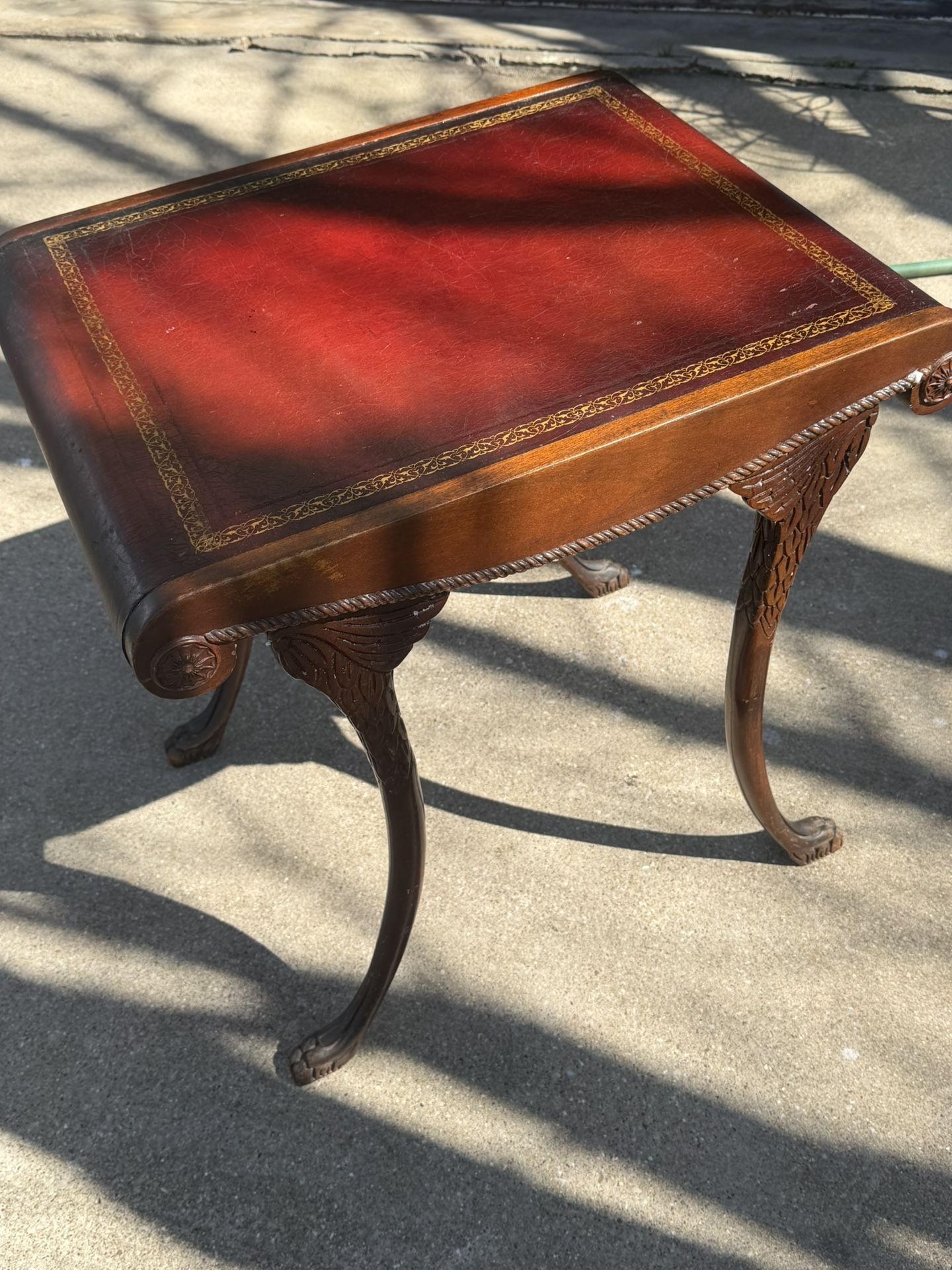 Chippendale-style mahogany side table featuring a gold-leaf embossed leather top. In great used condition !!