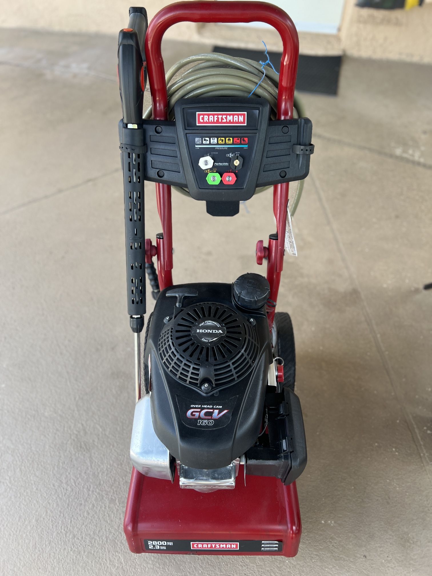 Excellent work conditions w like new come with hose, wand and 4 quick connect nozzle, Start in the first pull have strong pressure.