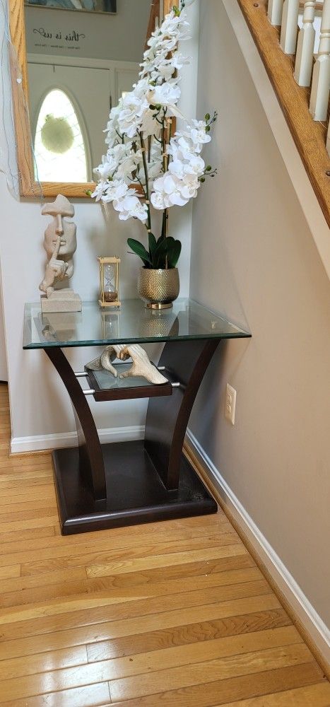 This is a beautiful table made from wood and has clear glass on top and frosted glass in the middle. Can be used for sofa side table or entryway. Dimensions: Glass square top: 27 inches Wooden base: 21.5 inches *Decor is NOT included* *smoke-free, pet-free* Pickup in Manassas 20112