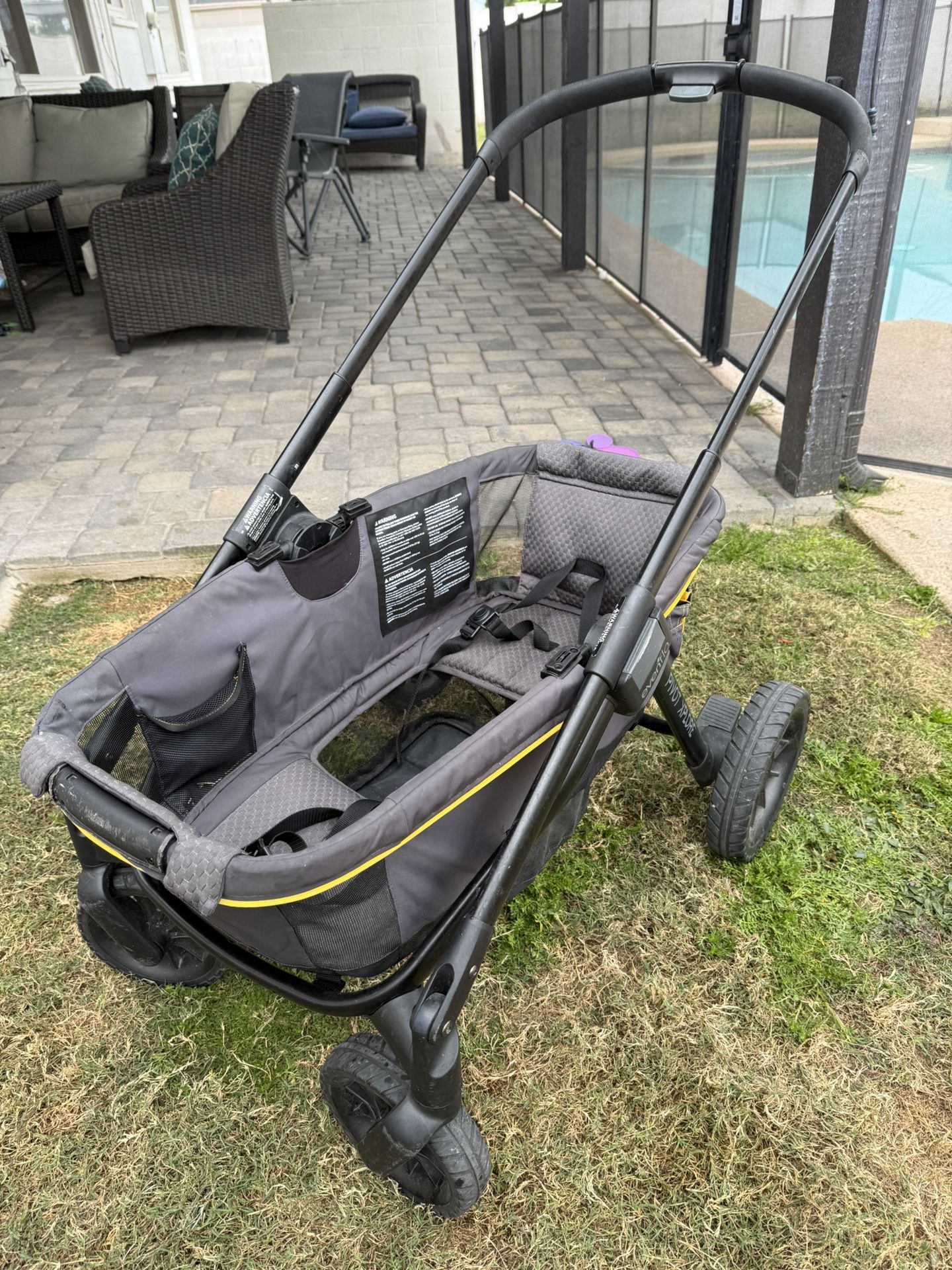 Used stroller wagon. Includes snack tray, 2 removable shade covers and additional attached storage bin not pictured