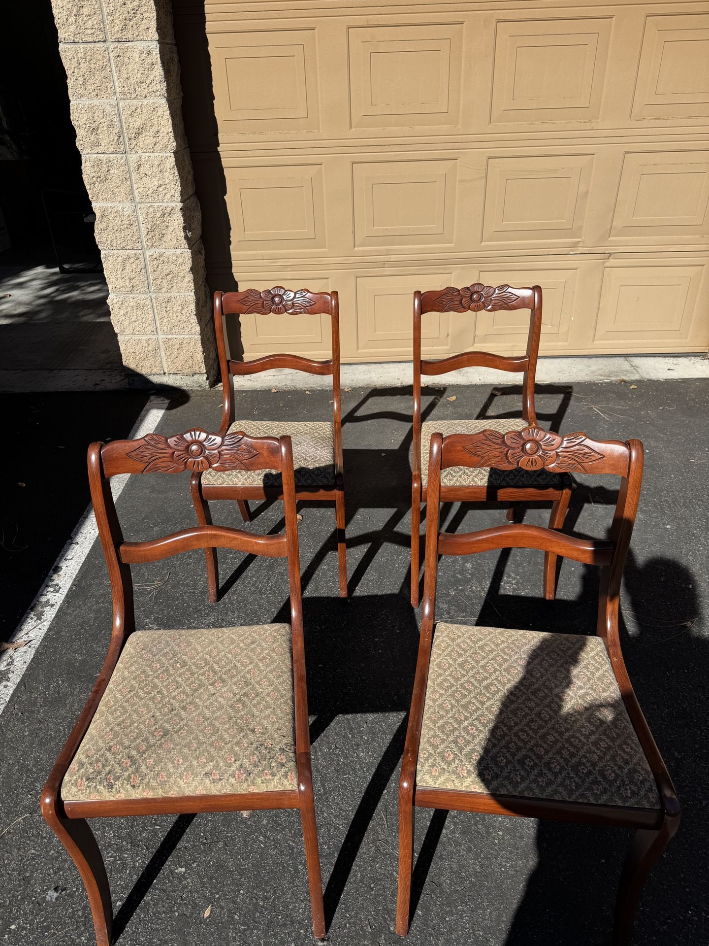 Set of 4 vintage dining chairs made by Tell City Chair Co. (Tell City, Indiana). • Pattern 4209, finish Mahogany 27 (original maker’s tags still under the seats) • Solid mahogany frames with beautiful carved floral/rose detail on the back • Curved saber legs and classic Duncan Phyfe–style silhouette • Original upholstered seats – fabric shows age and some wear but is still usable • All 4 chairs are sturdy with no loose joints These would be perfect for someone who loves vintage furniture or wants a reupholstery project with great bones. From a smoke-free home. Price: $170 for the set (OBO). Cash, Venmo, Zelle. Pickup only in Carmel Mountain - Poway