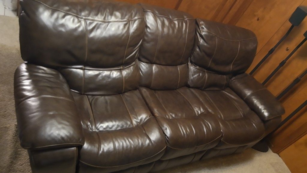 A real leather, three seat, dual power recline media sofa. Originally purchased through Macy's for $1300. It has an all steel frame and weighs approximately 225 pounds. You'll need 4 strong guys to come with to get it out of the house and loaded. I need it gone so the spare room can be set up as an actual spare room.