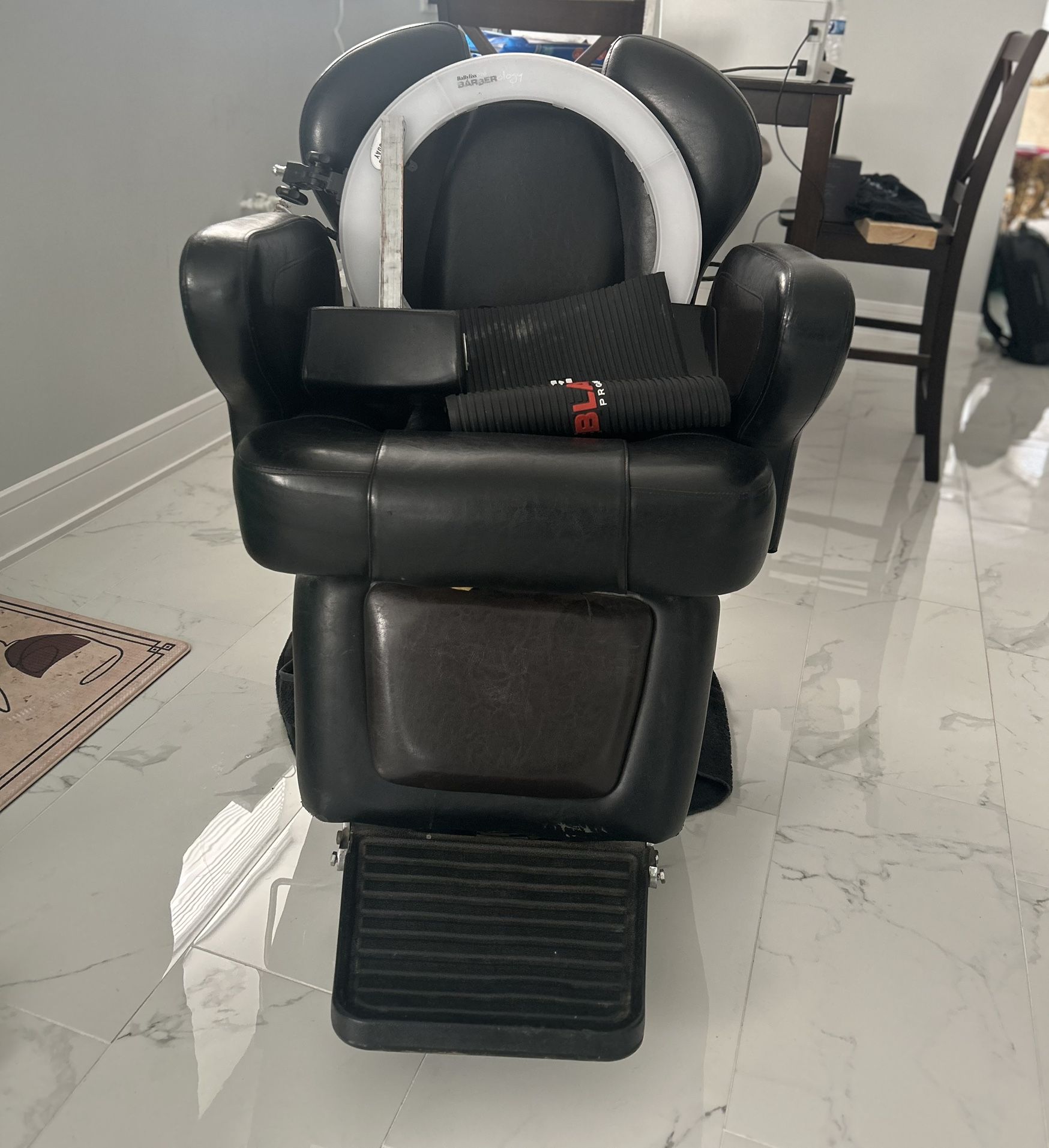Barber Chair is in good condition! Reclines perfectly hydraulics work perfect! Only thing is you gotta jimmy the neck rest for it to latch on but other than that a perfect chair! Im throwing the ring light in as-well with the ring light stand .