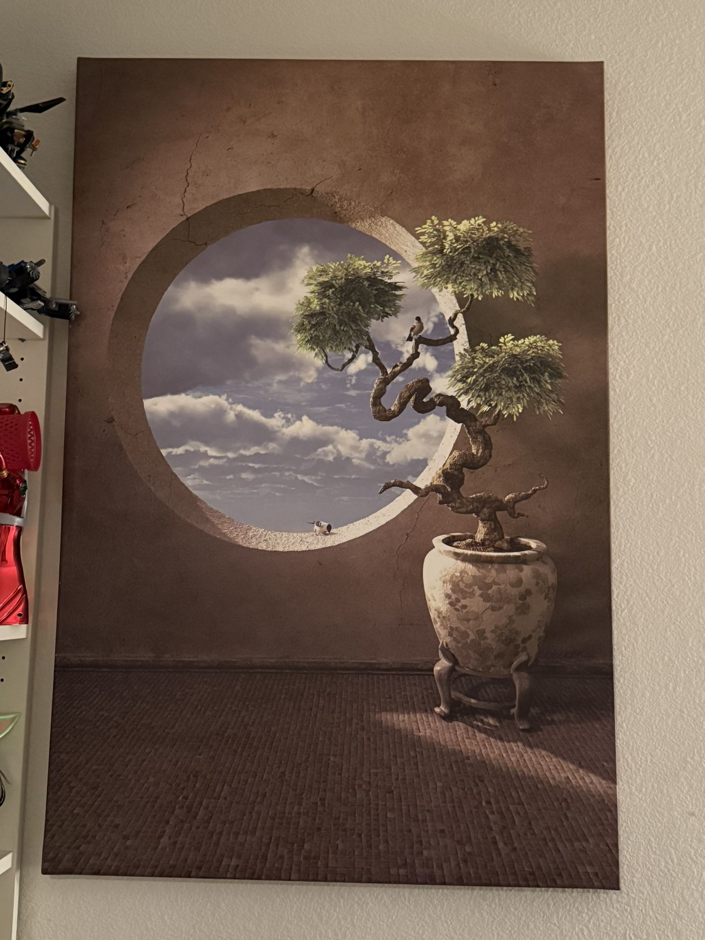 Beautiful Pier 1 canvas wall art featuring a bonsai tree with a circular window/sky backdrop. Neutral, calming tones—perfect for living room, bedroom, office, or meditation space. Great statement piece.