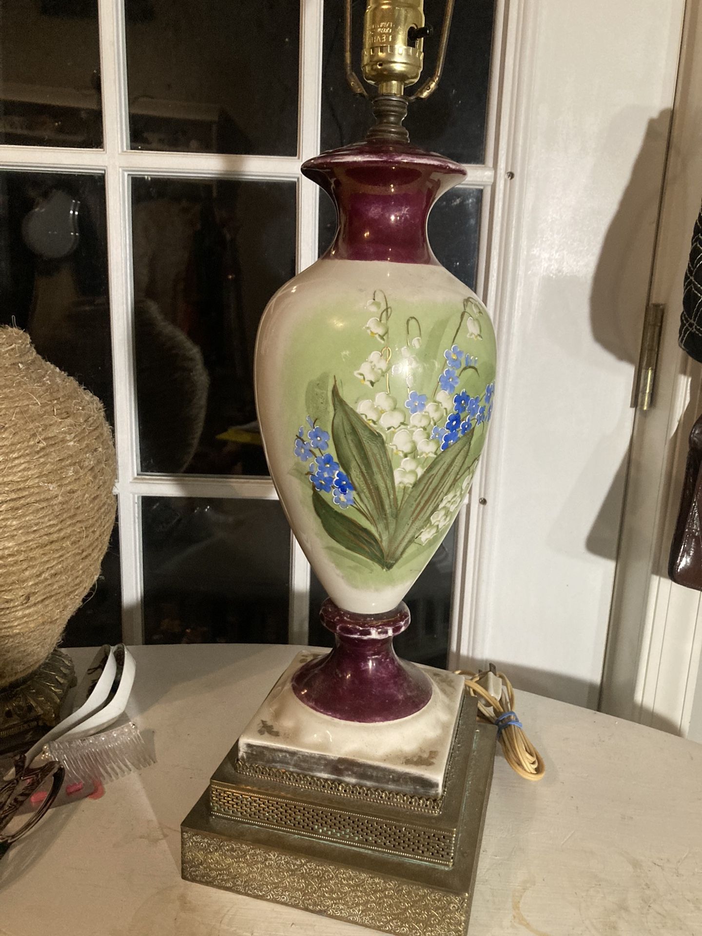 Has an ornate brass 2 layered base 7.5” square which the porcelain lamp sits on has a green & white floral design on both sides has 2 areas w/ wide burgundy bands a fantastic vintage design 22.5” h x 7.5” w