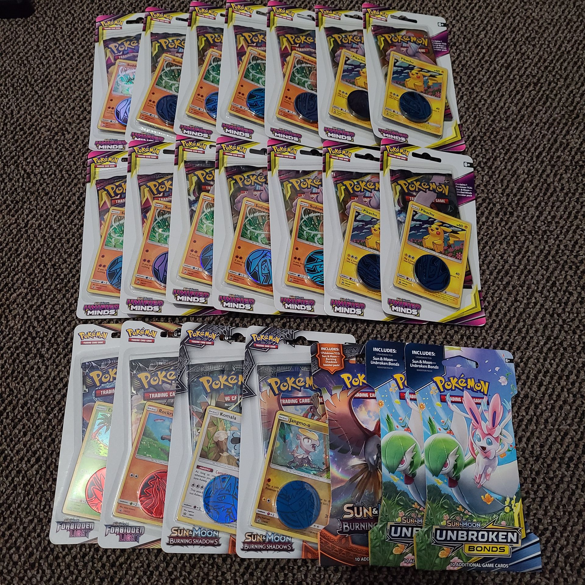 Unified minds Pika $120each (4) Unified minds Sudu $110each (10) Unbroken bonds $100each (2) Burning shadows $50each (3) Forbidden light $50each (2) $1900 for everything