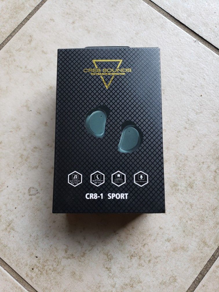 CR8-1 sport true wireless earbuds. Up to 3 hours play/talk time. Built in microphone. Box stores and charges earbuds. Three size of buds. User guide included.