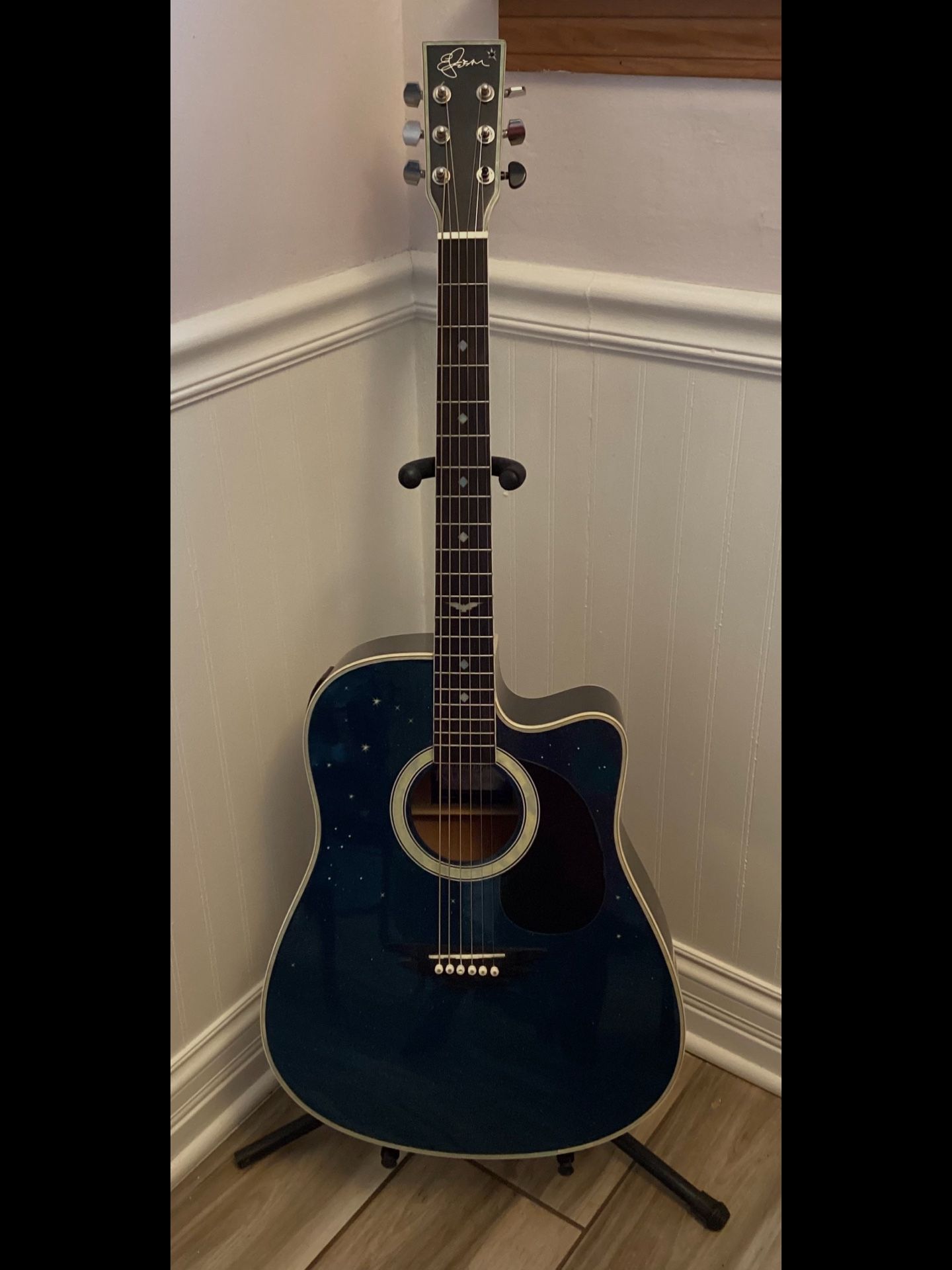 For sale 2009 Esteban midnight moon acoustic/ electric guitar. Guitar is in good condition. On board amp is in good working order. Old plastic bridge and saddle replaced. Guitar has been set up and adjustments made to the new bone nut and saddle. Truss rod adjusted Action slightly lowered for ease of play. Fret board lubricated New D’Adario bronze phosphorus strings installed. Guitar tuned Ready to play or collecting Please note: Sound board, sides and back are in good shape playability is good. Please note: Guitar is 16 years old Some defects apply See pictures for defect areas All in all, a great looking and sounding guitar If it’s listed it’s still for sale Cash only , no low ball offers entertained