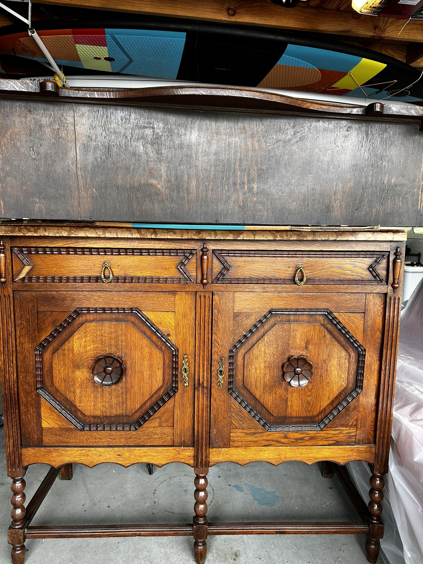 2 part hutch with rose colored marble top and a mirrored middle section.