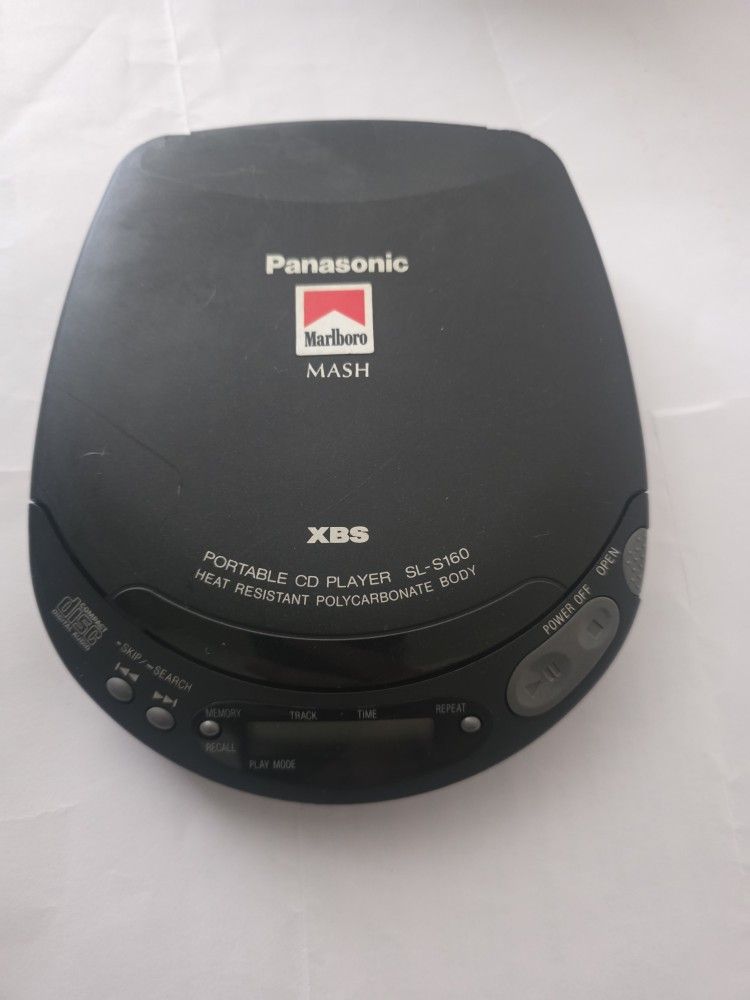 Panasonic SL-S160 Personal Portable CD Player is a vintage Marlboro Logo edition that is perfect for music lovers on-the-go. It is compatible with CD playback and has a built-in radio for even more listening options. The device features a headphone jack for private listening and MASH XBS technology for exceptional audio quality. With its lightweight design, this Walkman product line CD player is a stylish and convenient choice. It does not have any connectivity options, but it is perfect for those who prefer a simple device without any unnecessary features. The item is in excellent working condition MASH (Multi-stage Noise Shaping) technology and XBS (Extra Bass System) for enhanced sound quality. Never used, but once it left original packaging it shows just a few signs of wear from storage as shown in the photos $35 obo