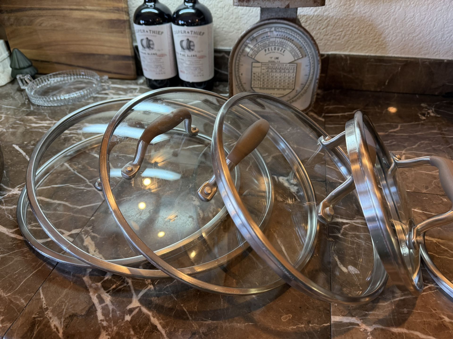 6 Anolon lids at various sizes. $5 each or $20 for all.