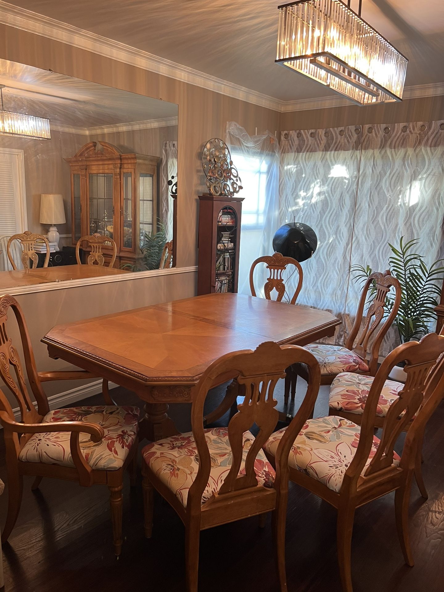 Chairs newly reupholstered w/ custom fabric and padded cushions (2 arm chairs, 4 regular) Brand new fabric and padding Table has two small air bubbles