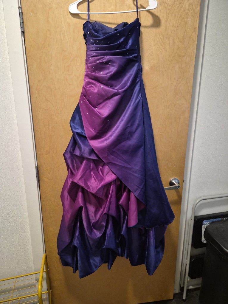 Prom dress from 2013 only worn once adorned with sequins and glass beads. A few sequins are missing but otherwise great condition. Strapless gown that fades from a royal purple into a pink.