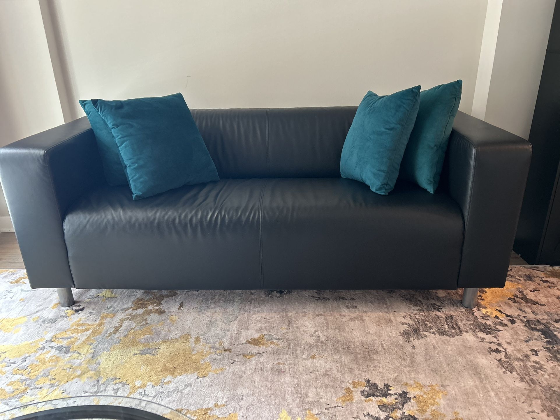 Gently used black faux leather sofa in excellent condition — less than 1 year old. No stains, rips, or damage. Comes from a smoke-free, pet-free home. Firm but comfortable seating, modern boxy design, and easy to clean. Looks great in any living room or office space. Price without pillows: $115 OBO Price with teal accent pillows: $130 OBO