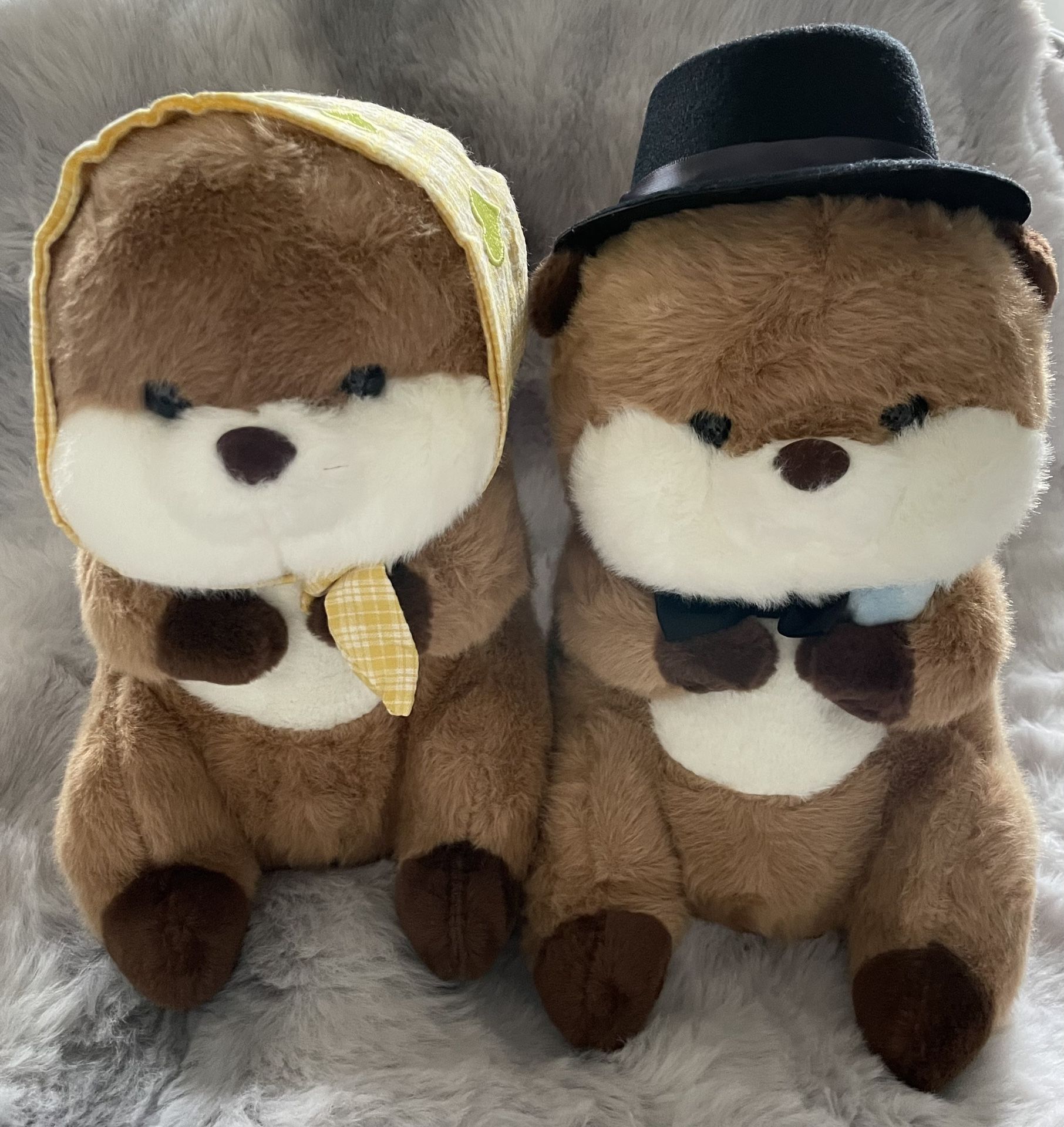 Super cute otter pair. Otters are holding little fish that can be taken apart. They’re 9 inches in height (not including the hat). I can ship if you message me and work out the shipping costs.