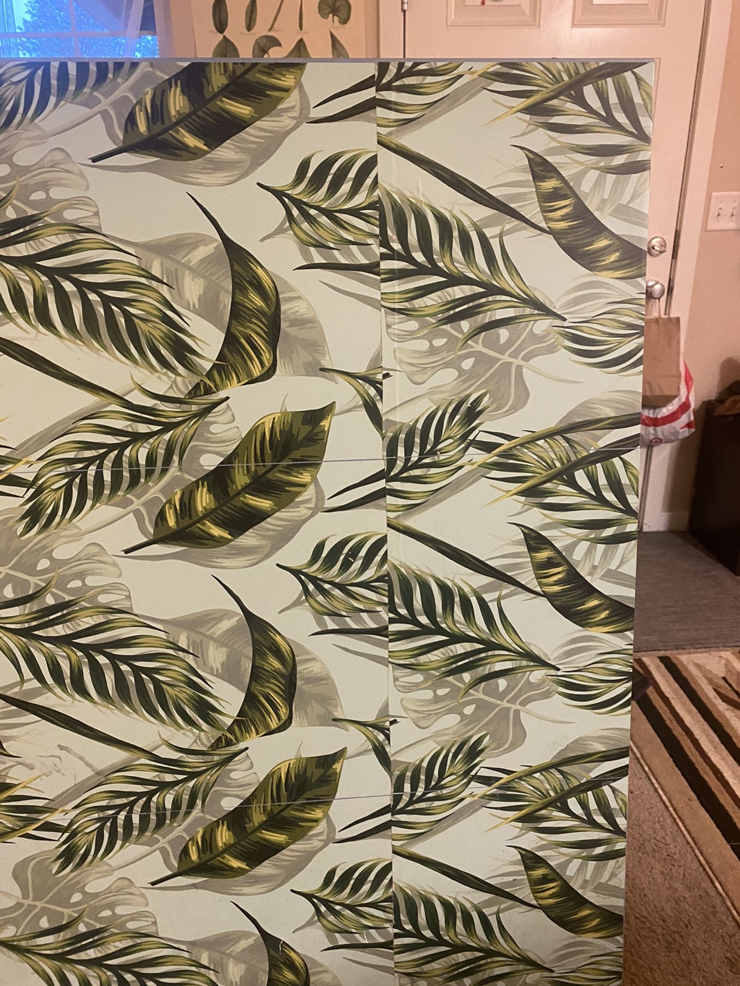 IKEA table and black chairs. Table has foliage backing to it. There are 4 chairs and the table legs (black) are included