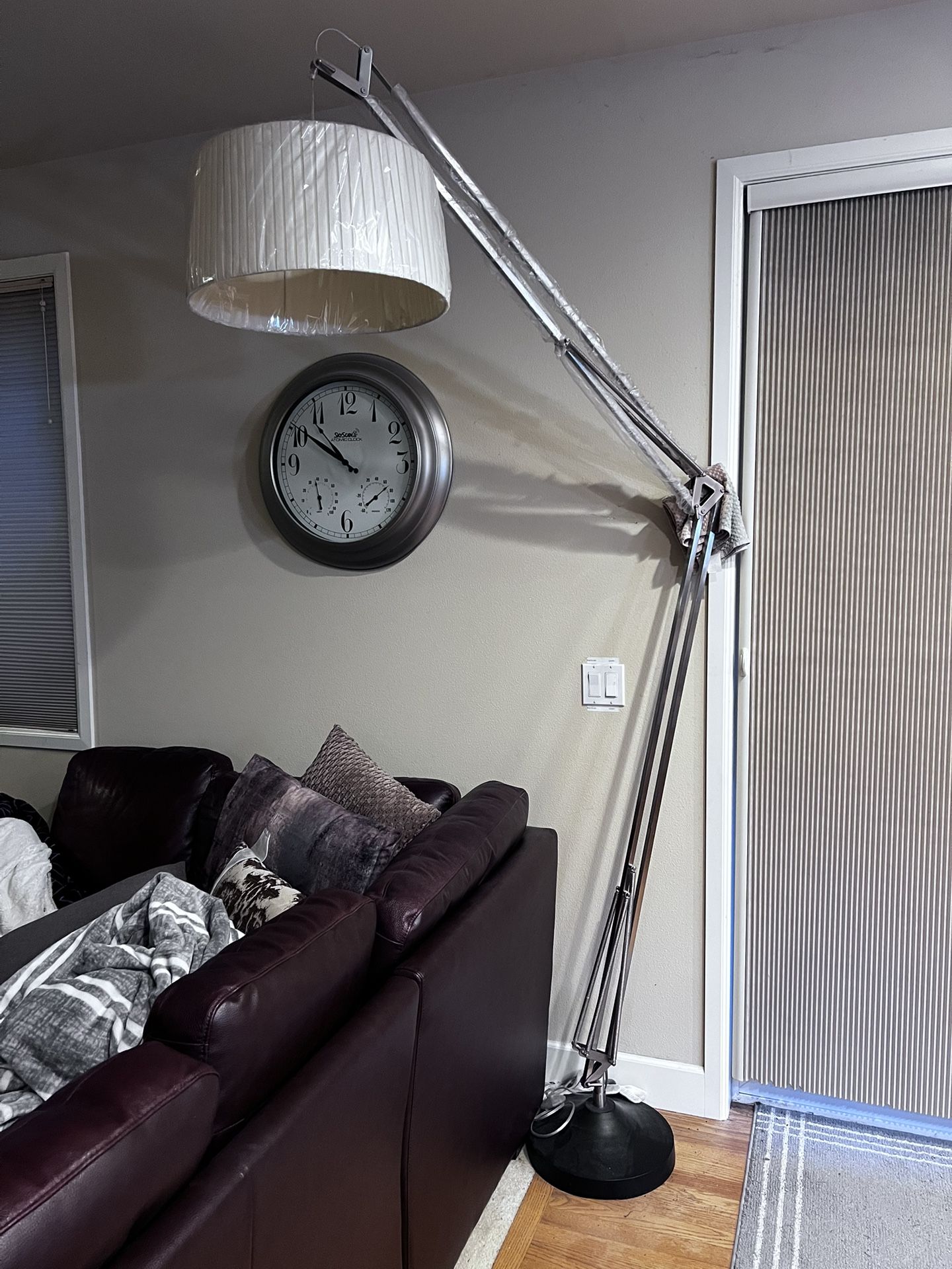 Metal frame, heavy duty floor base, big lamp shade In its current position, it is 96” tall Lamp shade is 20” diameter