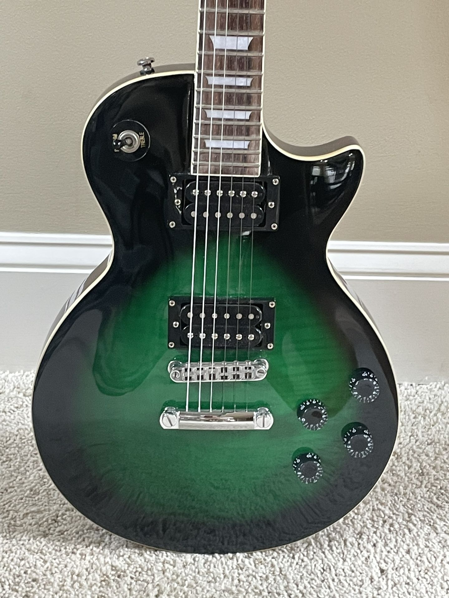 Beautiful Firefly LP Classic Electric Guitar. Beautiful Green color! Two humbucker pickups. Looks, works and sounds great!!! Must see and hear. Nice craftsmanship. Smooth neck. Set neck- not a bolt on. No dings or scratches. Bumper sticker on the back. It still has protective film on selector switch back cover plate. Excellent condition. No dings of note. Ready for pick up in Johns Creek 30022.