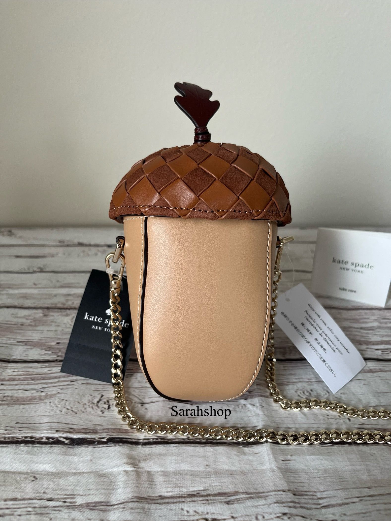 100% Authentic Brand new with tags Bag comes in original packaging KL918 3d Acorn Crossbody Brown multi and gold hardware 4.3" L x 6.3" H x 4.3" D Removable chain strap drop: 22”