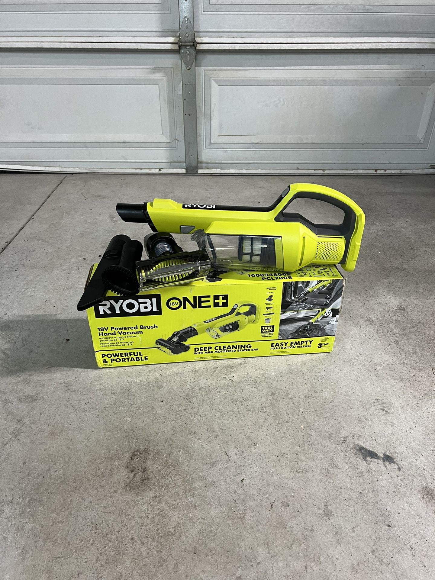 Battery not included New RYOBI ONE+ 18V Cordless Hand Vacuum with Powered Brush. Features Deep cleaning with mini motorized beater bar accessory, Pivoting head maintains close contact with surfaces, Easy to remove brush roll for quick cleaning and maintenance, LED lights for increased visibility. Retails for $94+tax