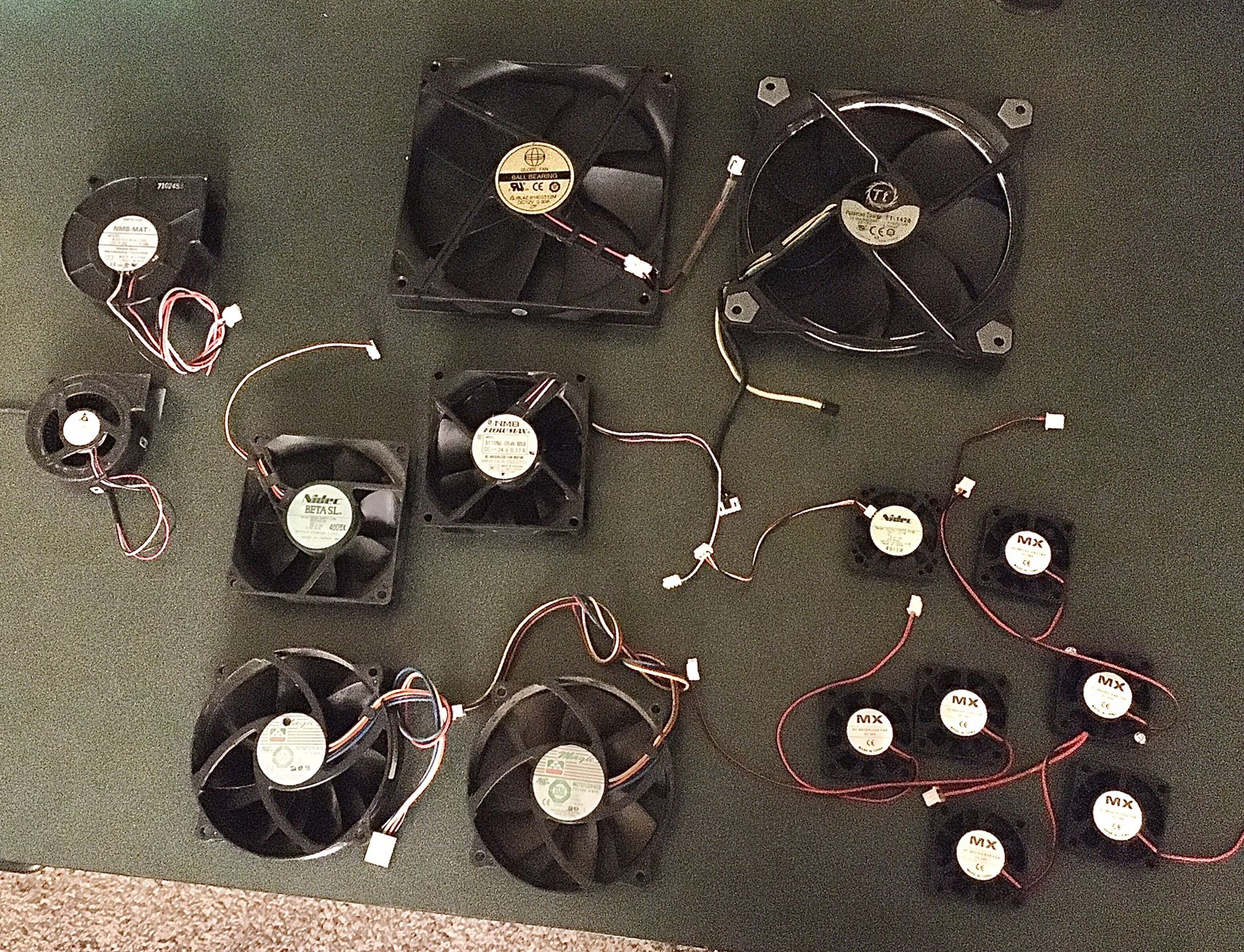 I have a box full of computer fans of various sizes. I forgot to get measurements on the smallest ones, but the measurements of the others are shown in the pictures. Contact if interested and check out my other ads too, thanks!