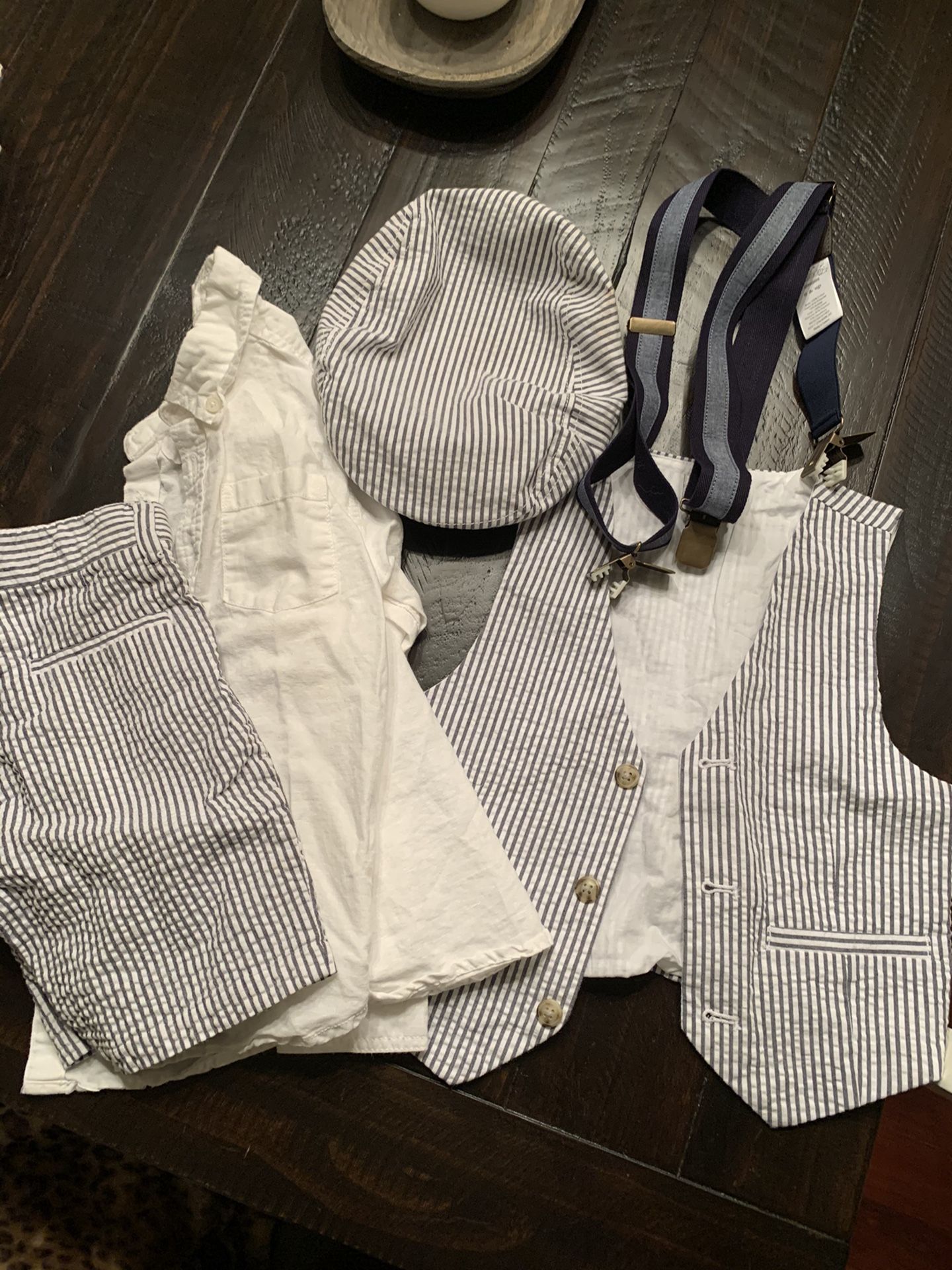 Boys outfit, includes shorts, button up undershirt, vest, suspenders and hat. Size 5-6 boys, smoke free home