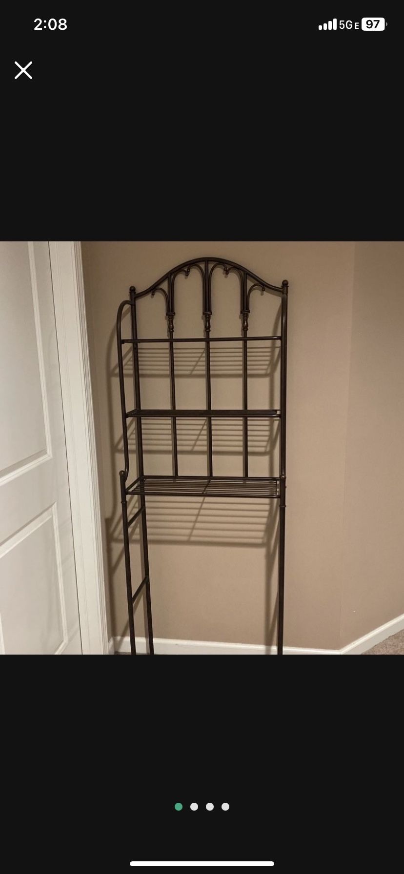 Bronzed, metal, 3-tier, over the toilet unit. Great space saver for holding towels, toiletries, decor, etc. It is heavier than most.