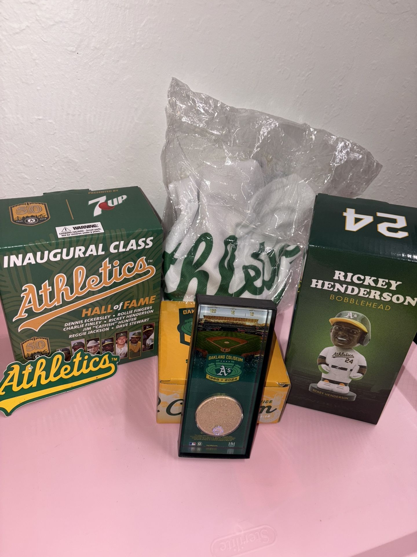 Includes: small coliseum replica, bobble head, XL pride jersey, one Athletics sticker, 7 UP hall of fame merch and dirt from the ballpark.