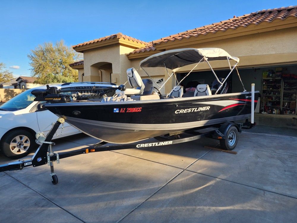 Boat crestliner 2014 fish hawk 1650.deep V Boat 17 feet.very good condition inside & outside. ..TITLE IN HAND.. Mercury 60 hp 4 stroke. Low hours Everything on boat working Good Has live well. Fish finder. Good trolling motor TERROVA. REMOTE CONTROL. SPOT LOCK. Trailer folding away Has good Bimini top.good carpet Good 5 seat. $ 19500