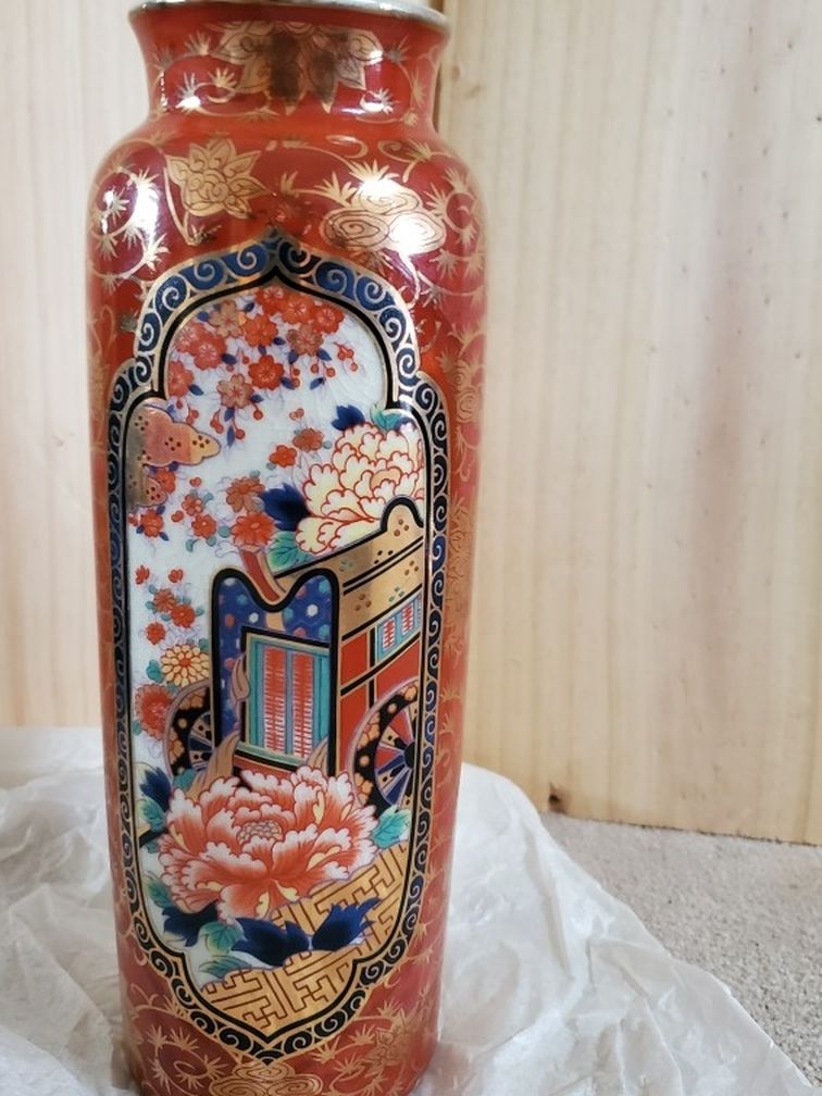 Vintage Japanese Kutani Porcelain Imari 12” Flower Vase Gilded Red Gold Blue New never used. At least 30 years old Vase, household decoration, flowers, painting, Japanese, Japan, flower Vase, living room, couch, dining room,