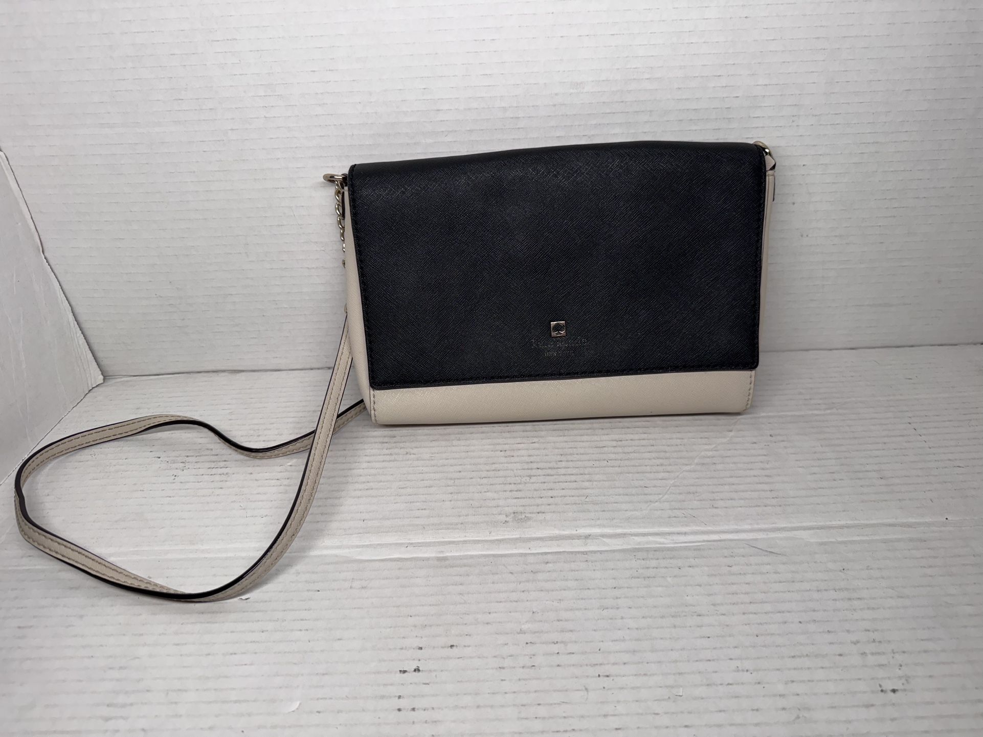 This is a Kate Spade Charlotte Street Alek Crossbody bag in a black and pumice colorblock design. Used condition. Has blemishes. It is worn. Kate spade logo is faded. Priced low to sell quick.