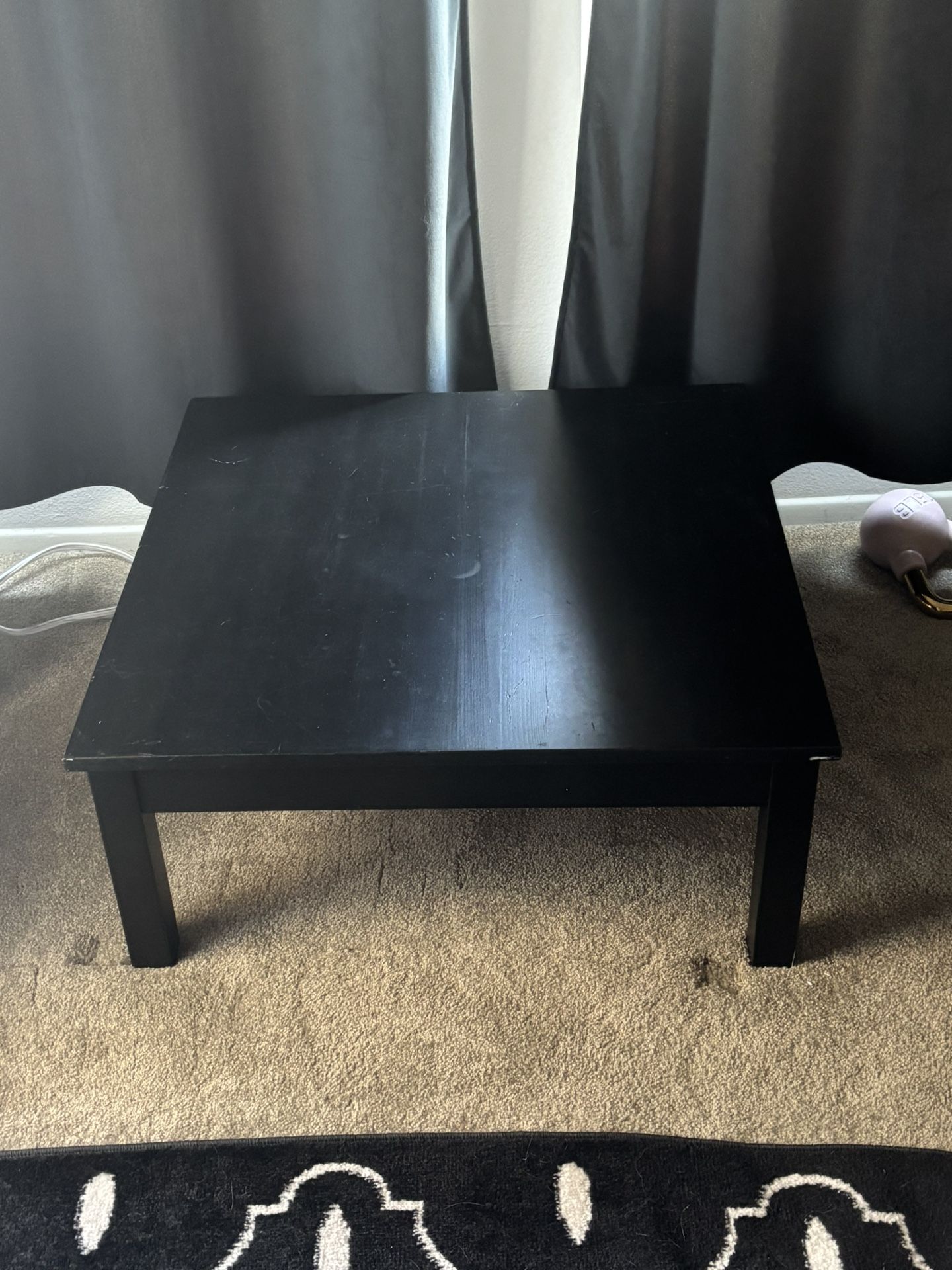 Short black coffee table. I cut half the legs off an IKEA table. It measure 29.25”W x 29.25”L x 12.75”H