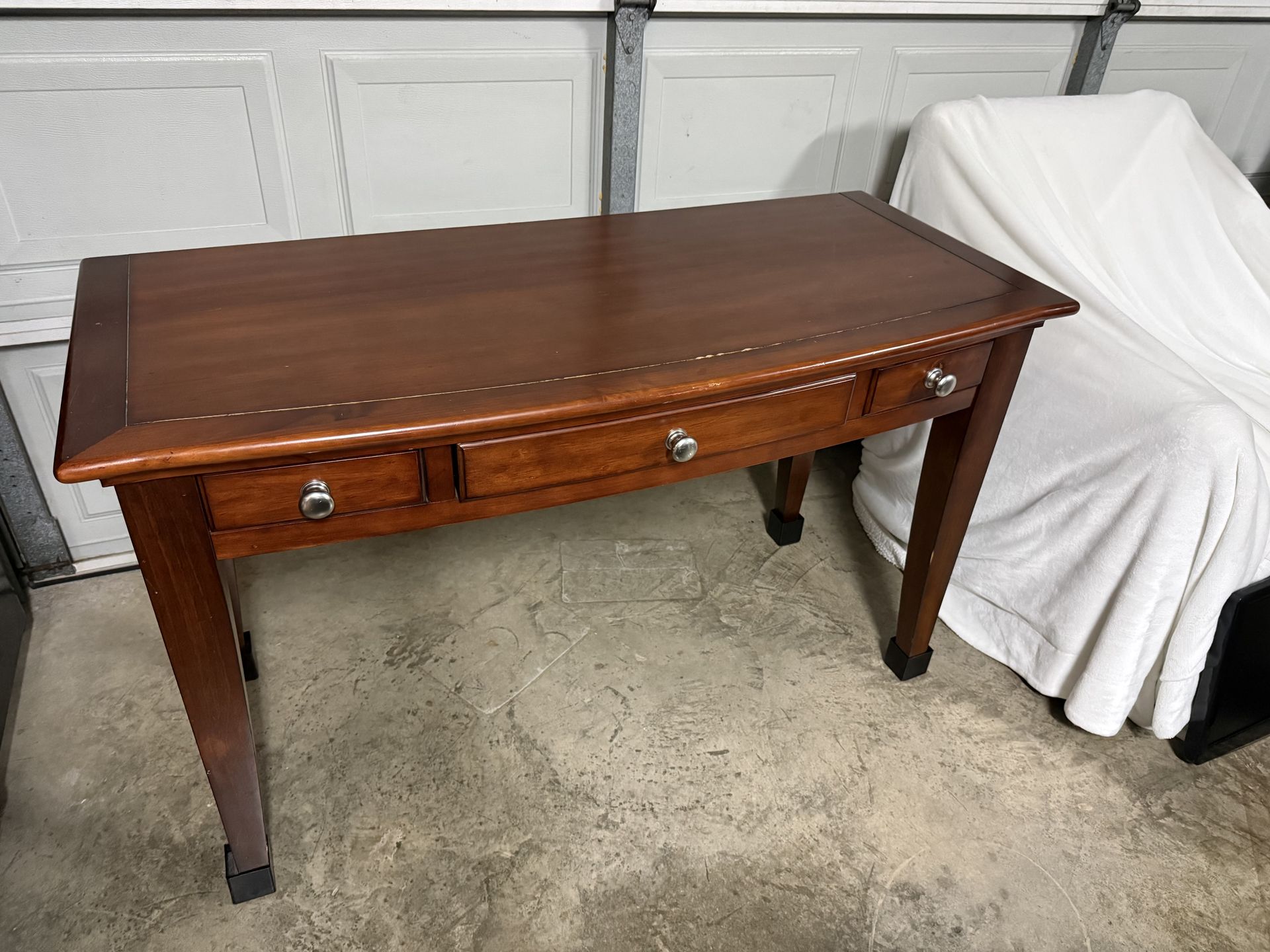 Beautiful Cherry Wood Bedroom Set – Full Size Selling a very nice cherry wood bedroom furniture set in great condition. All pieces feature matching warm cherry finish with silver/brushed nickel hardware throughout. Set Includes: ∙ Full Size Bed – Solid wood frame with elegant arched headboard and footboard ∙ Nightstand – 2-drawer bedside table with curved bow-front design ∙ Chest of Drawers – Tall 5-drawer chest, perfect for clothing storage ∙ Office Desk with Hutch – Writing desk with 3 drawers plus a removable organizer hutch featuring cubbies, shelves, and 2 additional drawers. Hutch can be removed if needed. Details: ∙ 🚛 Buyer must pick up – no delivery available ∙ Mattress included with bed frame ∙ Bedding NOT included ∙ All pieces sold as a set are in great condition with minimal wear