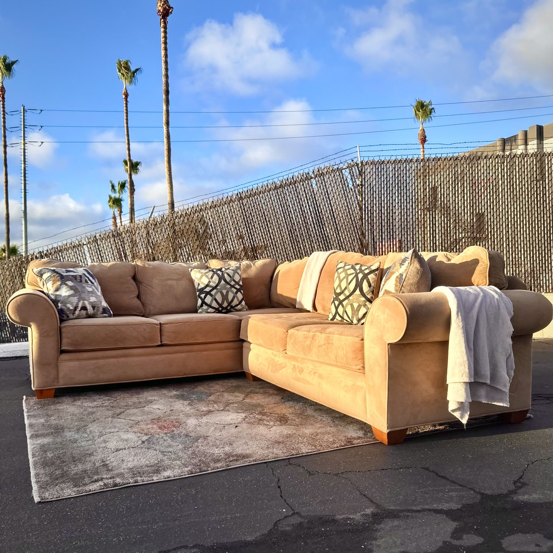 Comfortable Back and Seat Cushions, Smooth Microfiber Fabric, Two Sections, Professionally Cleaned. Excellent Shape. Original Condition. Custom Order from Macy's. $2000+ Retail Value. Dimensions: 112in Long Side, 98in Short Side, 36in Tall, 18in Seat. Pickup in 92109 or Delivery with Zipcode.