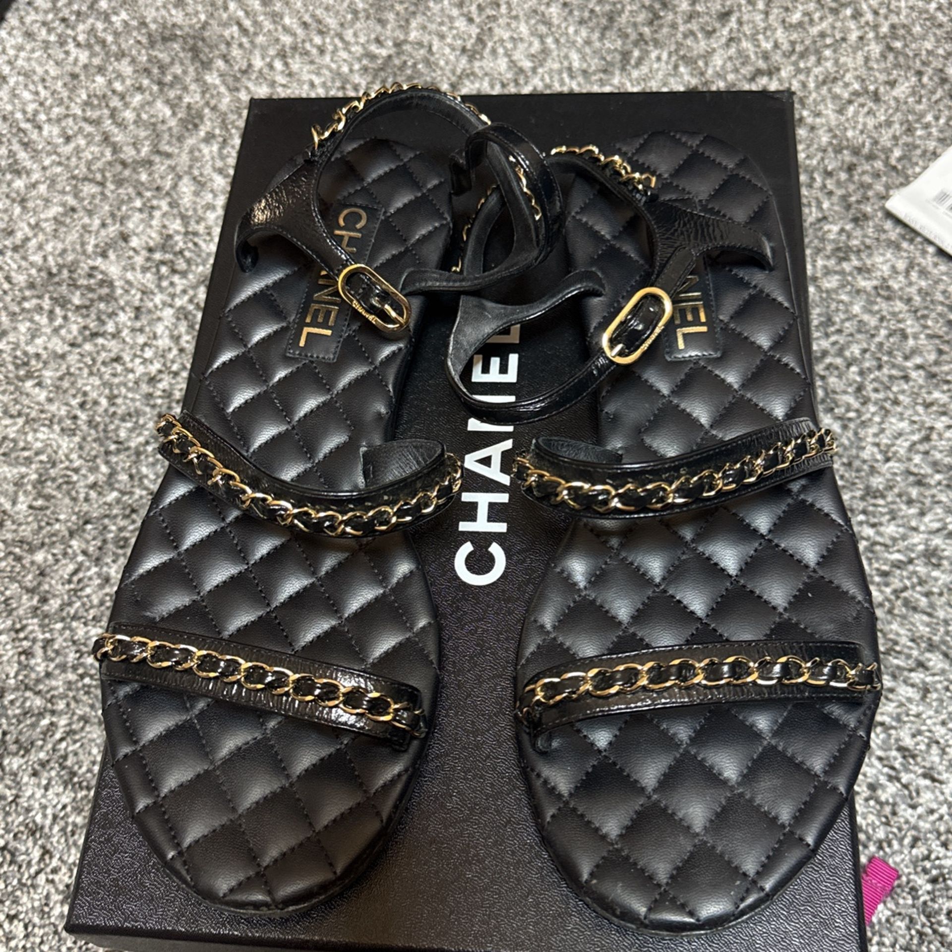 Used Chanel sandals still has lots of life left. Perfect luxury item on a budget. Fits size 9.