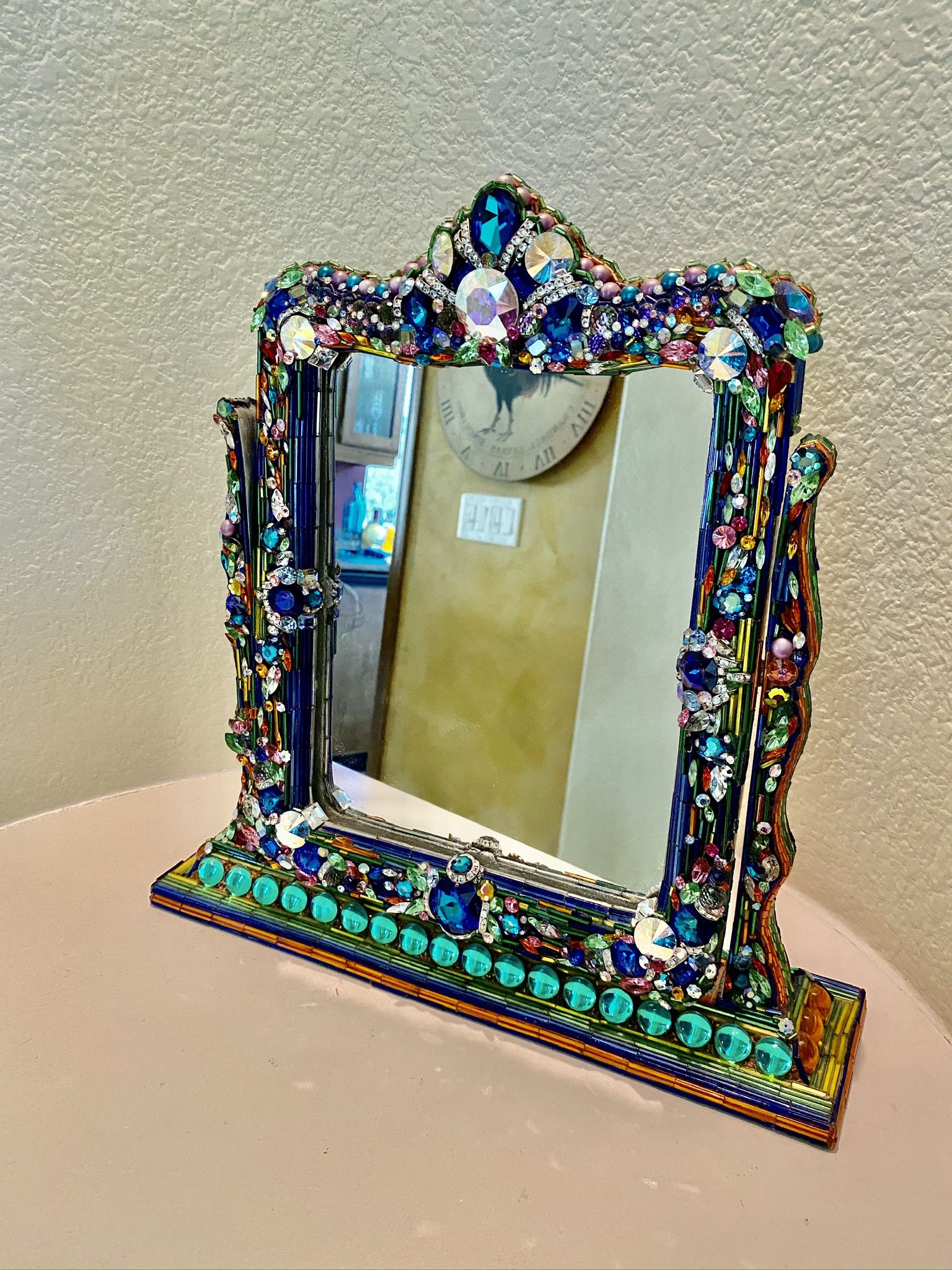 Signed and dated by famed jewelry designer Simone Edouard. One-of-a-kind jeweled tabletop mirror adorned with an opulent mosaic of hand-set glass, crystals, and faceted stones in vibrant jewel tones. The sculptural frame features layered textures, iridescent finishes, and a richly dimensional design that sparkles from every angle. Set on a sturdy, decorative base, this freestanding mirror functions as both functional décor and statement art. Bold, glamorous, and highly collectible, it brings a touch of luxury and artistic flair to a vanity, console, or display shelf. A true showpiece for eclectic, bohemian, or maximalist interiors.