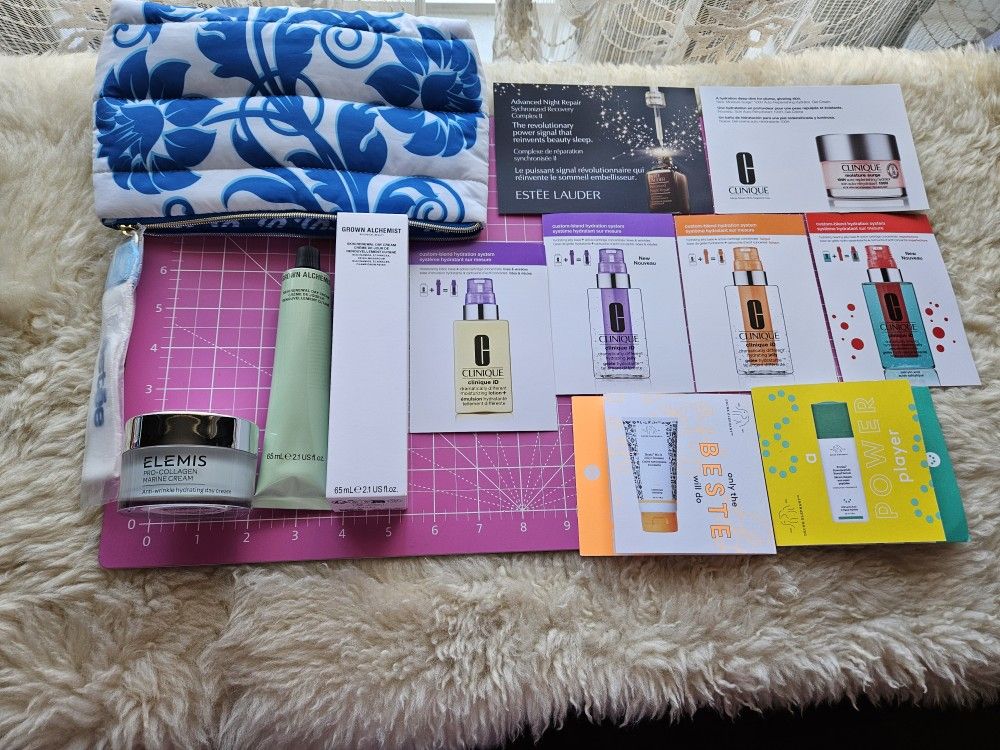 ELEMIS & GROWN ALCHEMIST DAY CREAMS, ESTĒE LAUDER MAKEUP TOTE, & 8 HIGH-END SAMPLE-CARD FREEBIES