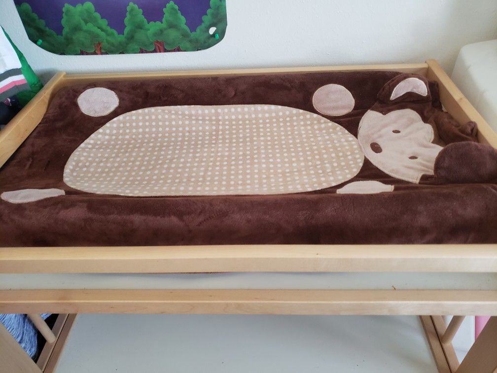 Excellent condition with a changing mattress that straps and locks over so mattress won't move. Has 2 different covers: monkey and green furry one. Has 3 shelves, top one for changing. Could also be used as shelf for clothes or shoes, whatever works, pls no low balls!