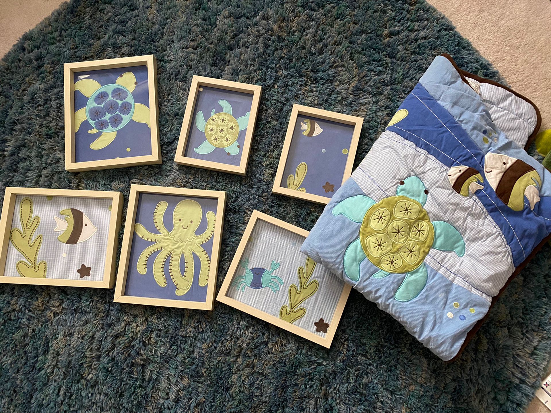 Used in baby nursery. Blanket, two valance, 6 pictures (with or w/o frame).