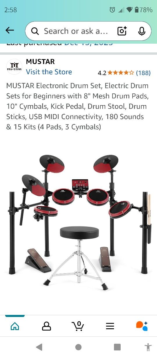 Very much like new. Kit was assembled and never played. Comes with everything in the box: 3 symbols, 2 kick pedals, 2 toms, 2 snares, stool & sticks.