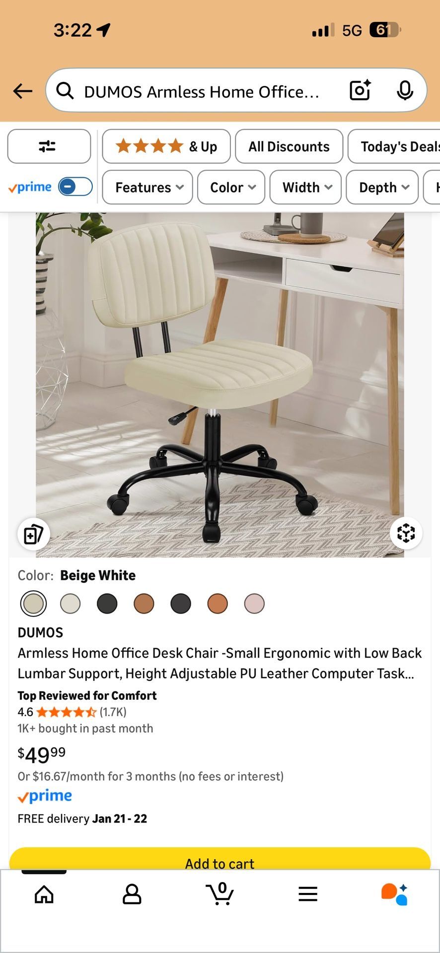 DUMOS Armless Home Office Desk Chair -Small Ergonomic with Low Back Lumbar Support, Height Adjustable PU Leather Computer Task with 360° Swivel Rolling Wheels, for Small Space, Beige White