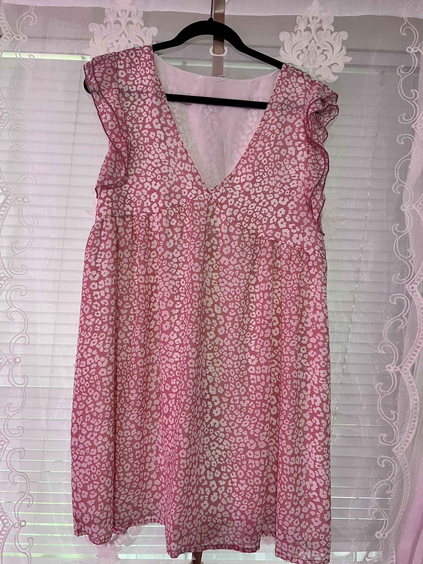 This cute, lined, light weight pink flowered is great for summer’s. Wear it either to church services or an afternoon bbq. Depending on height dress hangs slightly above knee or below. Ruffled sleeves and ruched back. No stains or damage
