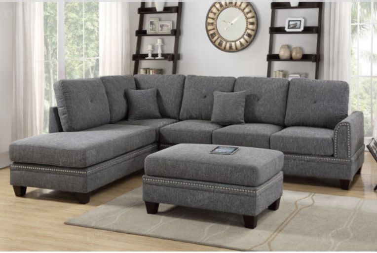 Sectional Sofa Ottoman Sold Separate Item # F6511 Sectional Item # F6515 Ottoman Suited for contemporary or classic living space, this 2-piece sectional features extra plush seating with pillow back and seats. Its frame is trimmed in nickel plated studs with short brown leg supports. Available in ash black (blended fabric, blue cotton (blended fabric), or citrus (polyfiber). Color: Ash black Materials: Polyfiber Plywood base panel with solid pine frame. Wood legs, fiber batting back cushion, Pocket coil seat cushion with foam encasement. Some Assembly Required Dimensions: Sectional: 112″ x 85″, Ottoman: 38″ x 26″ x 20″H