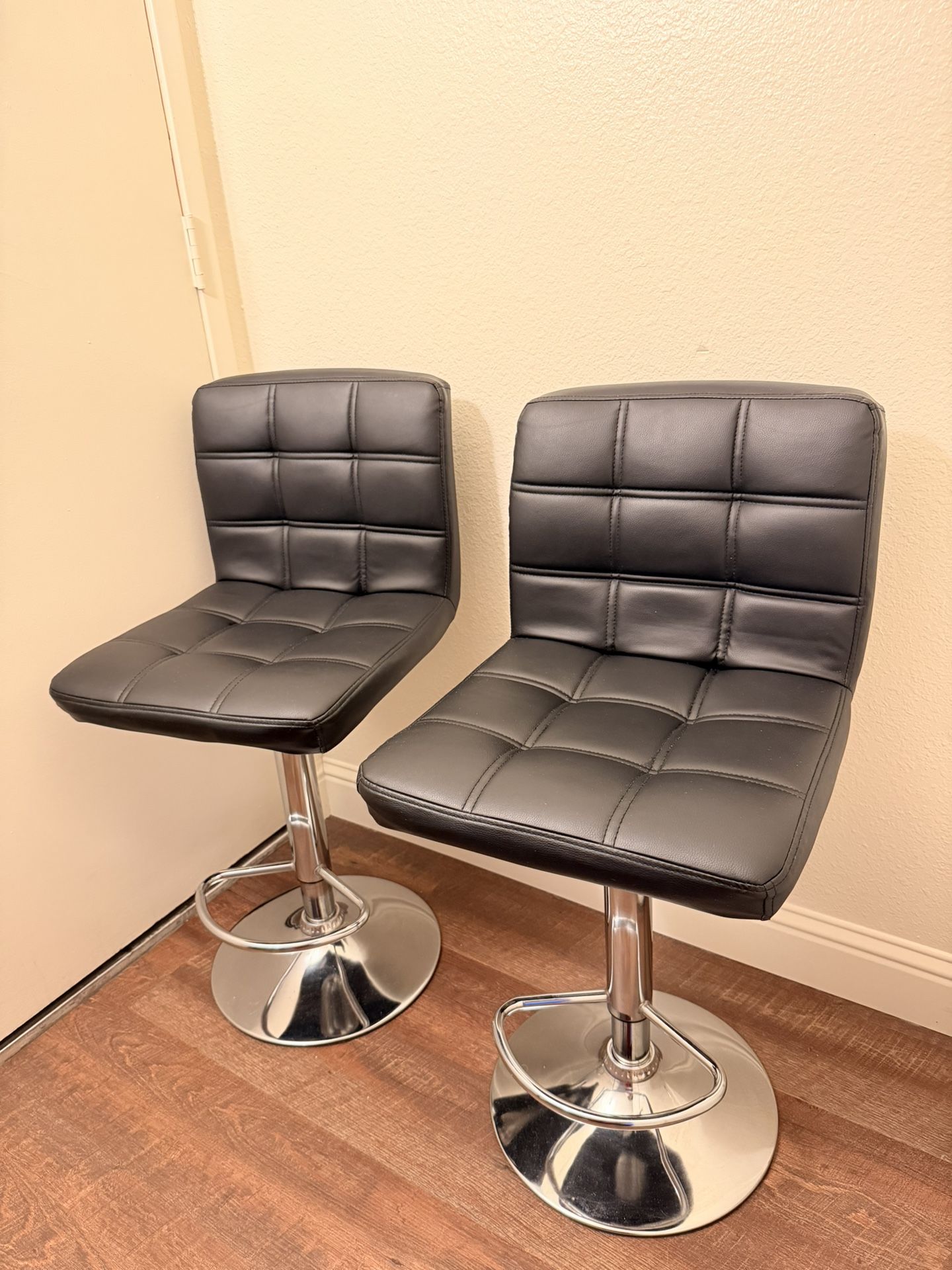 Barely used black leather barstool chairs—still in great, like-new condition! We’re moving and don’t have space for them anymore. $80 for the pair, OBO.