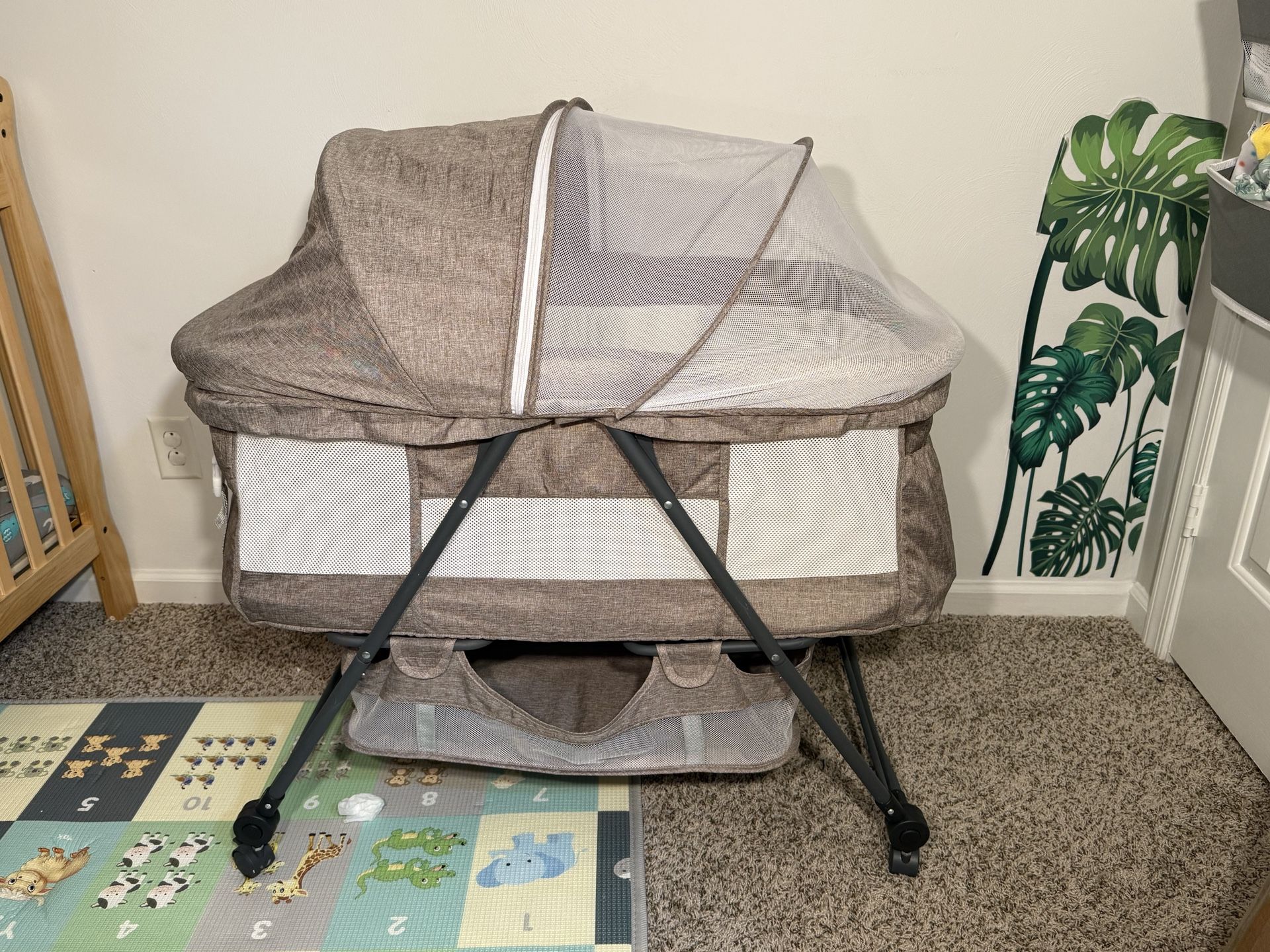 Baby bassinet gently used. Easy to set up and take down to move around. Simple and easy design. Comes with two side pockets and hanging storage underneath. Great to even have outdoors since mesh screen when canopy is expanded.